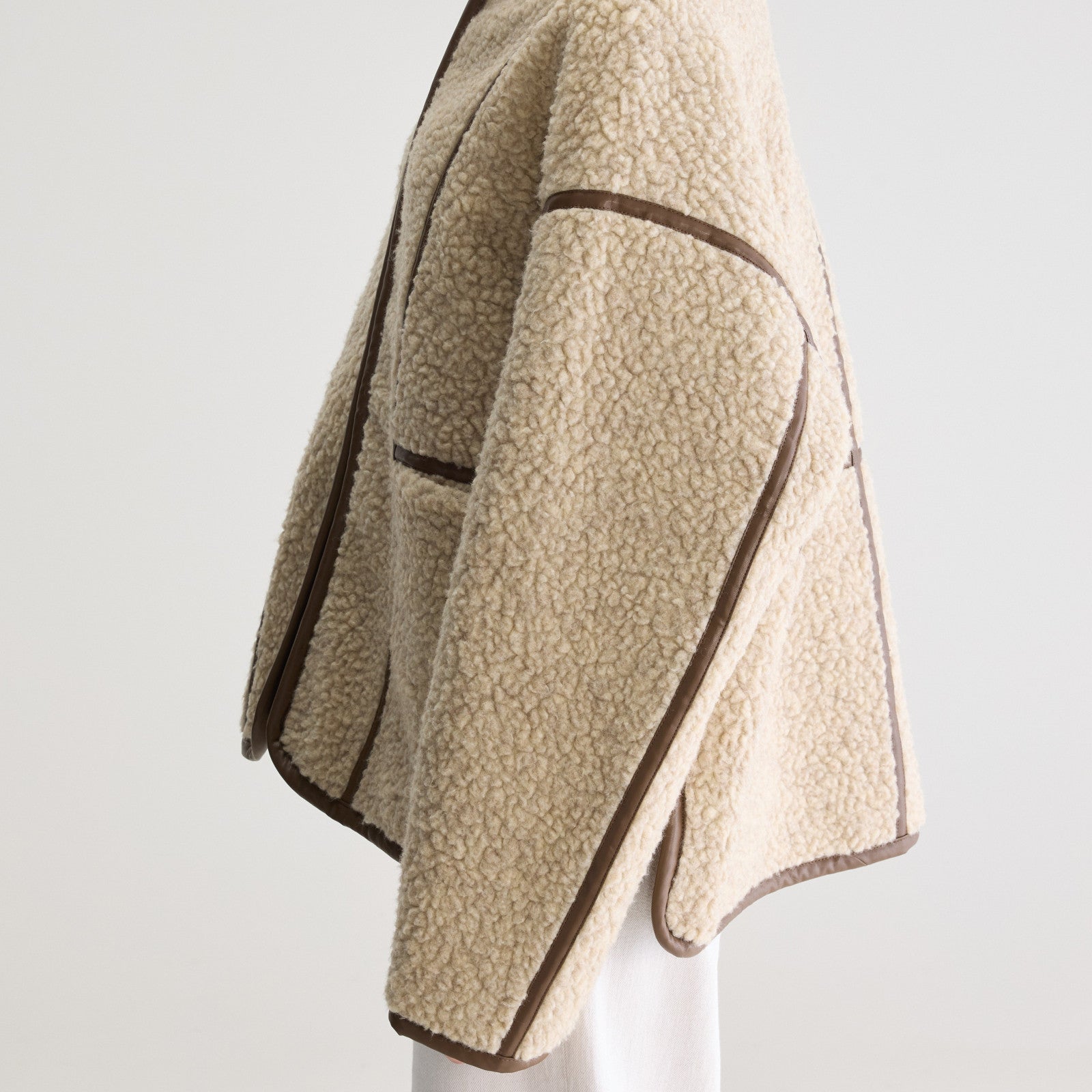 Die Übergangsjacke Jina von Bellerose ist wie eine Umarmung für draussen – weich, strukturiert und durchdacht. Der naturfarbene Teddy-Stoff bringt Wärme und Ruhe, während die kontrastierenden Paspeln der Jacke eine klare Form und moderne Silhouette verleihen. Der Schnitt ist boxy, die Schultern leicht überschnitten, was Jina zu einem perfekten Layering-Piece macht. Ob auf dem Weg zum Markt, beim Spaziergang durchs Quartier oder als gemütliche Begleiterin an kühlen Morgenstunden – diese Jacke passt sich deinem Tempo an. In den grossen aufgesetzten Taschen finden Hände, Schlüssel oder Fundstücke Platz. Ein Lieblingsstück für alle, die in der Übergangszeit nicht auf Komfort und Stil verzichten wollen – weich wie ein Herbstblatt, stark wie ein Frühlingsmorgen.