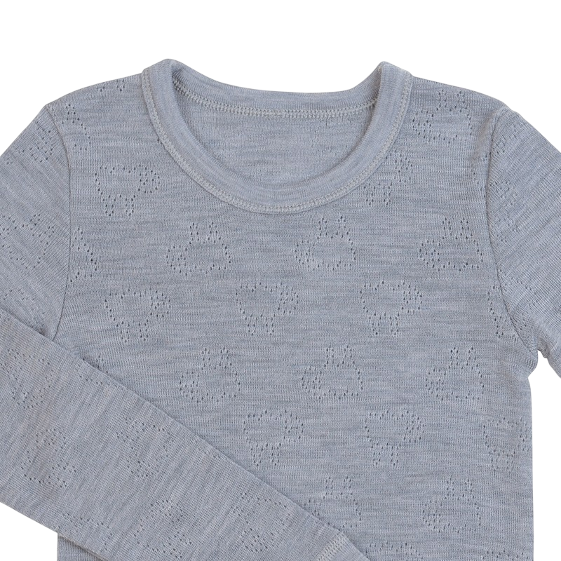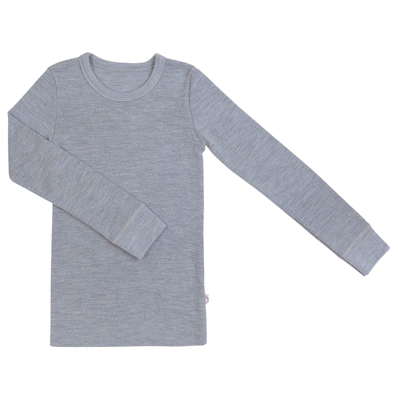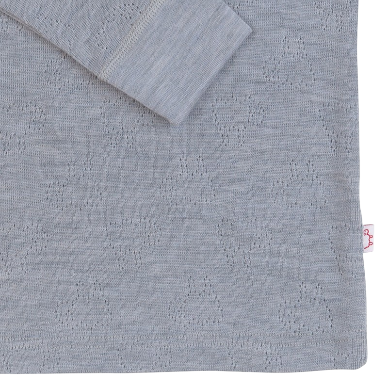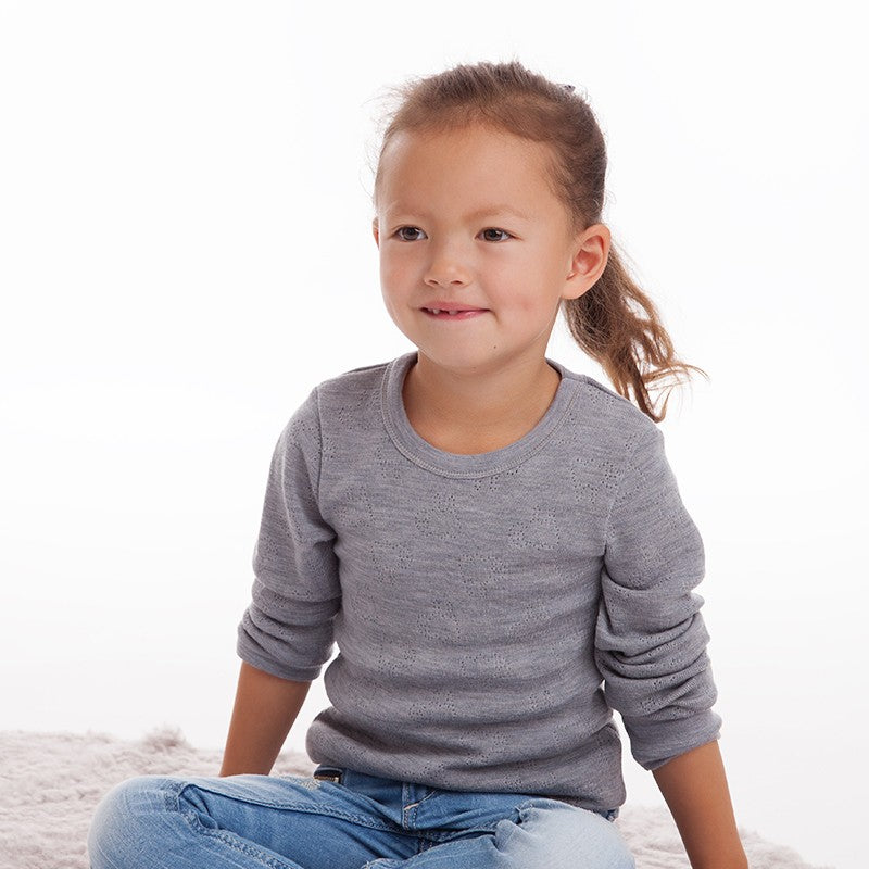 Superbequemes Oberteil, dass Ihr Kind Tag und Nacht tragen möchte! Entwickelt für den täglichen Gebrauch - sei es auf dem Spielplatz oder auf dem Gipfel eines Berges! Aus superweicher, kratzfreier 100% Merinowolle hergestellt. Merinowolle ist temperaturregulierend und kann Feuchtigkeit schneller abtransportieren. Nimmt Gerüche weniger schnell an und bleibt länger frisch. Zartes Lochmuster-Design. Erhältlich in drei verschiedenen Farben.