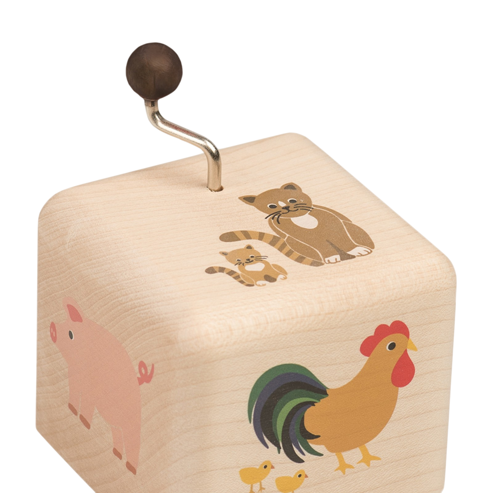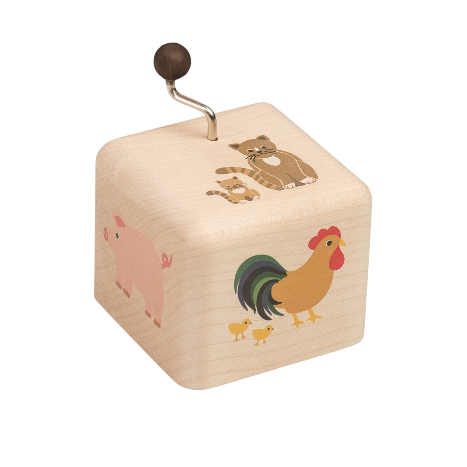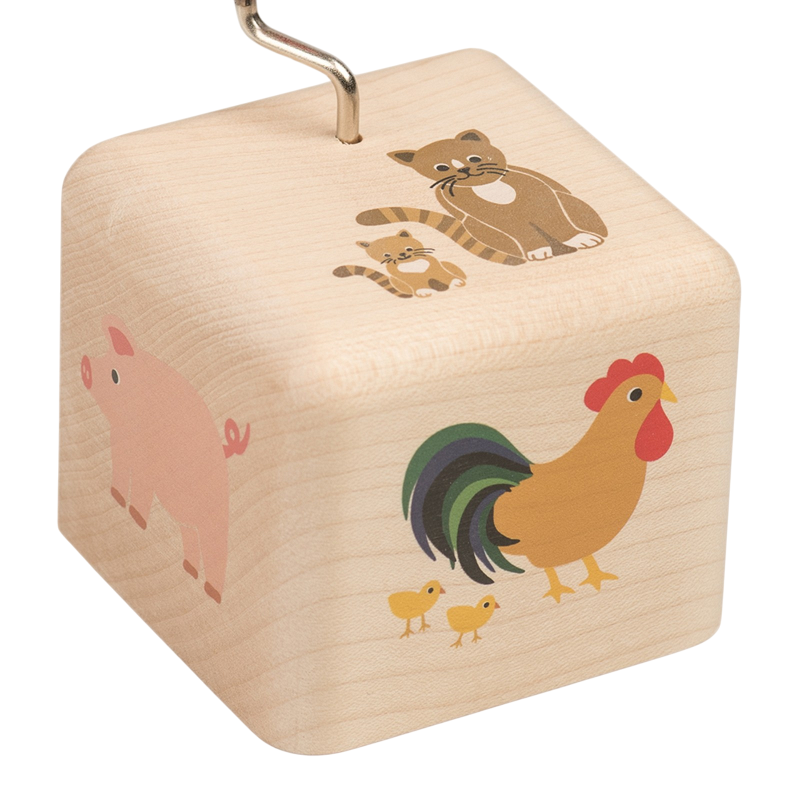 Der Klangwürfel «Haustiere» von Kiener bringt den Klang des Vertrauten ins Kinderzimmer. Hund, Katze, Hahn und Schwein sind liebevoll auf Holzseiten gemalt. Dreht dein Kind an der Kurbel, erklingt eine sanfte Melodie – ein musikalischer Bauernhof im Miniformat. Kinder können die Tierfiguren benennen, Tierstimmen nachahmen und dazu kleine Geschichten erfinden: „Der Hund hört die Musik, die Katze tanzt dazu.“ So entsteht Rollenspiel und Klangwelt in einem. Der Würfel eignet sich für ruhige Spielstunden, für Einschlafrituale oder als Impuls in der Kita. Ihr könnt ihn in Klangkreise einbauen, Tiergeschichten weiterspinnen oder ihn beim Spielen mit Holzfiguren kombinieren. Hergestellt aus Schweizer Holz und sorgfältig bemalt, verbindet Kiener hier Klang, Alltag und Handwerk zu einem Produkt, das vertraute Bilder und neue Melodien spielerisch verknüpft.
