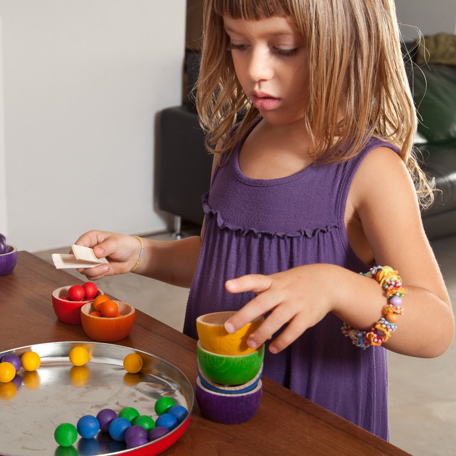 Das Schalen und Murmeln Set von Grapat bietet eine farbenfrohe Kombination, die Kinder zum Sortieren, Zählen und kreativen Spielen einlädt. Die sechs Holzschalen und die dazugehörigen Murmeln in leuchtenden Farben fördern die Feinmotorik und regen die Fantasie an. Kinder können mit den Schalen ihre eigenen Muster und Strukturen legen oder sie in Rollenspiele integrieren. Ein vielseitiges Set, das sowohl lehrreich als auch unterhaltsam ist.